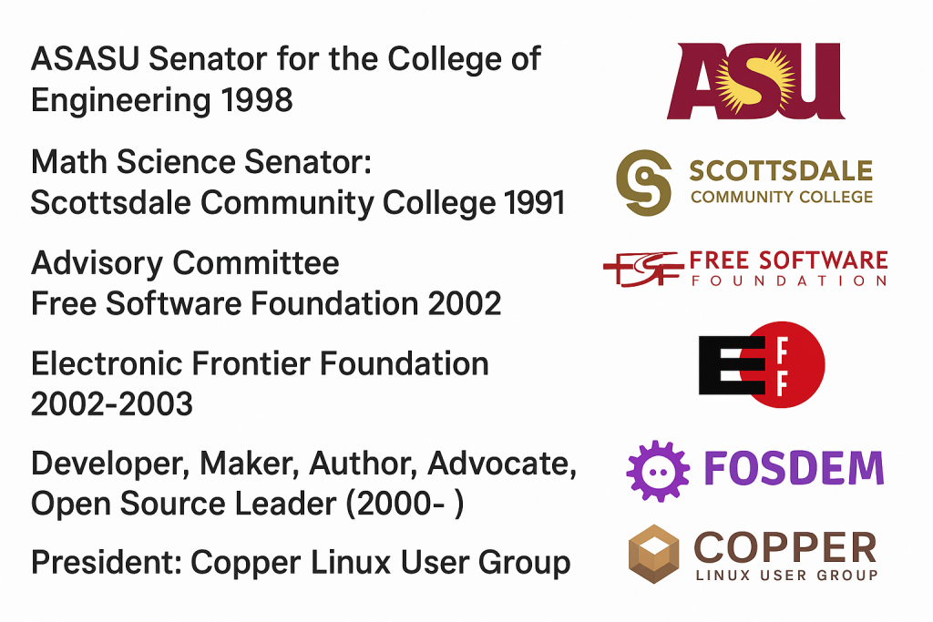 Makerspaces - Regular contributor: Heatsync Mesa AZ, Gangplank Chandler, Peoria, Queen Creek, AZ. Did a mobile Lab at NYC HOPE 2022 with 3D printer, robots, raspberry pi and more. Consulted with UTAH makerspace, Invited to NYC, Boston, New Jersey and California makerspaces. Tally Ho mall Preston, CT Makerspace - Founder 2022. Closed.